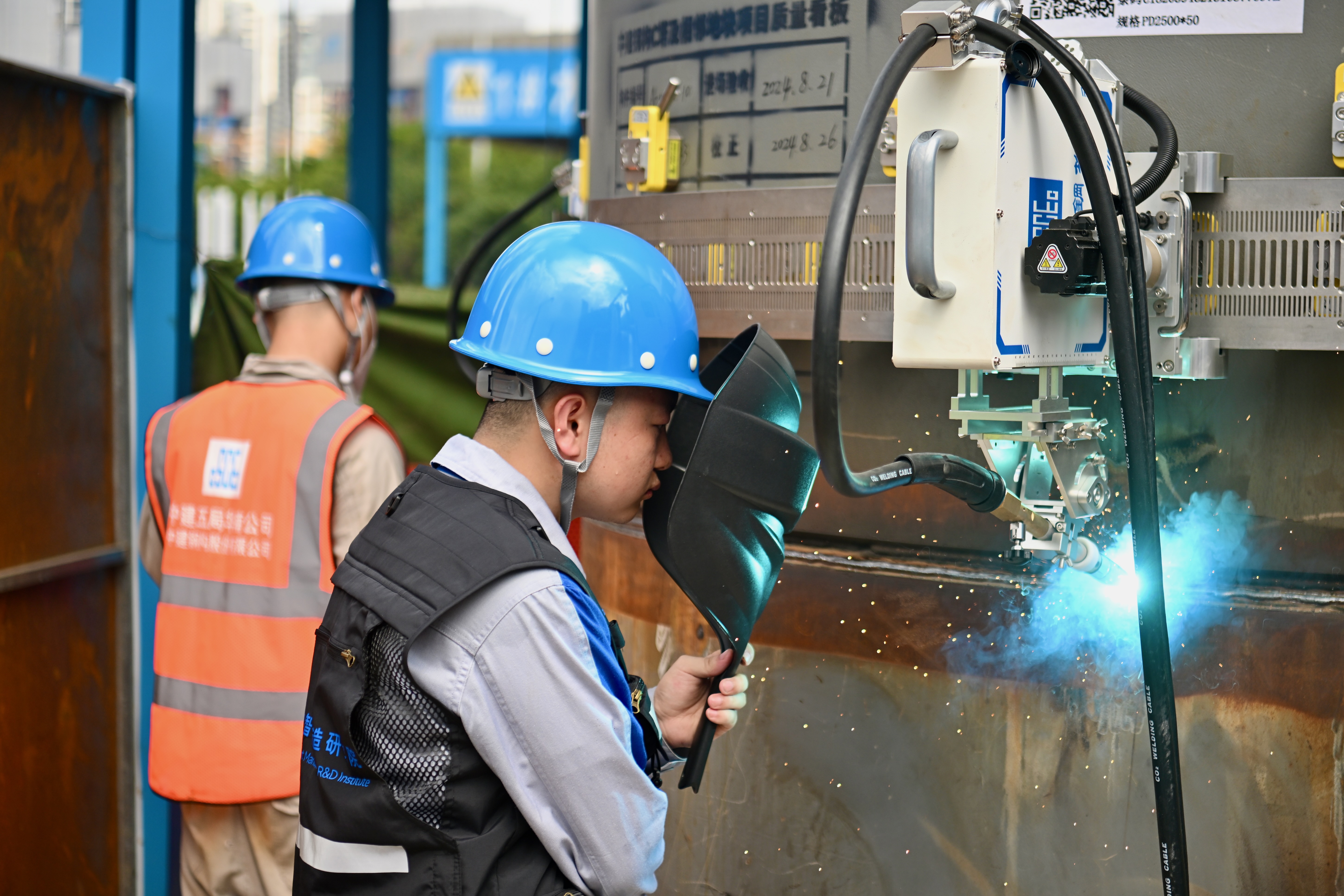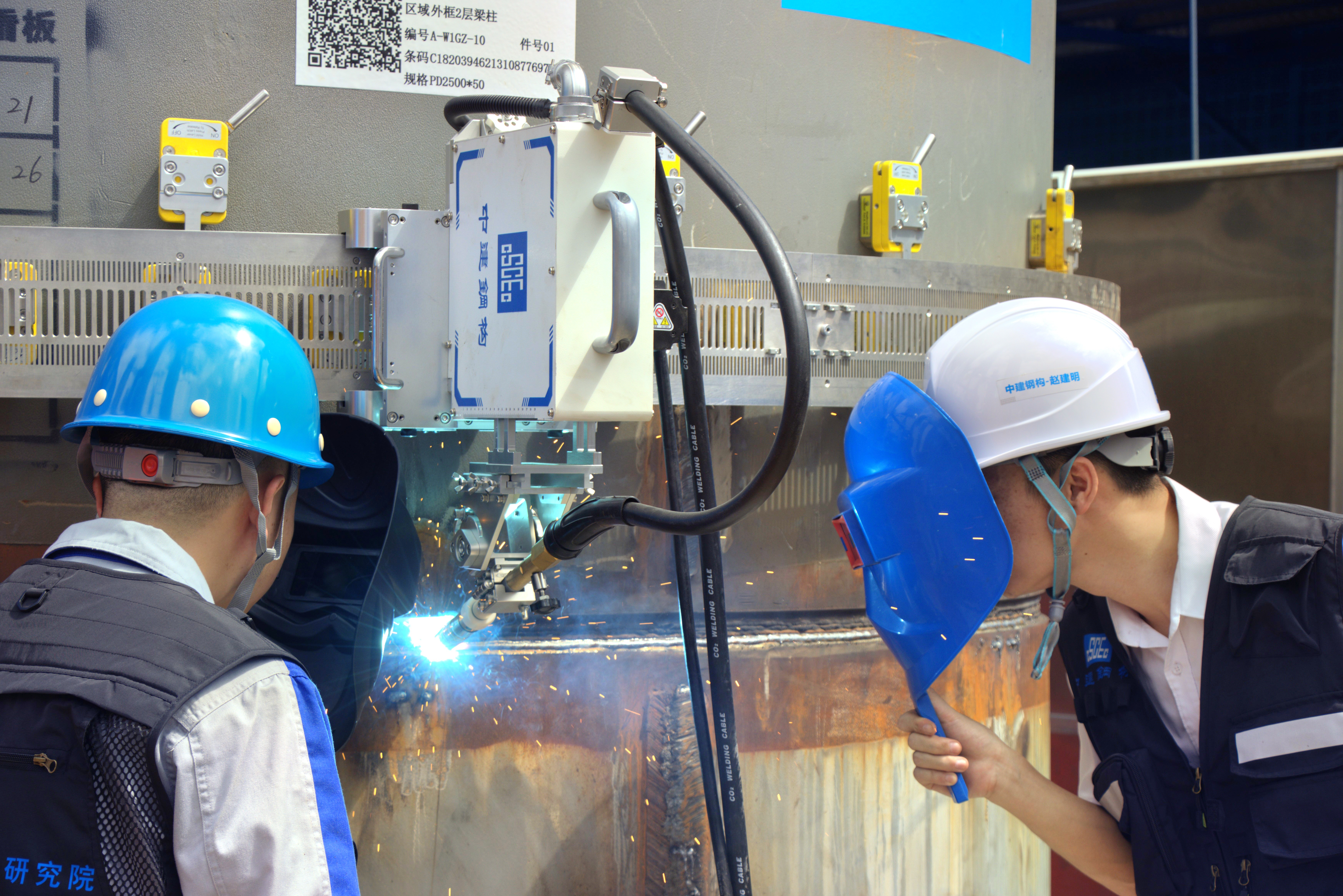 由深湾发展公司开发建设、中建五局承建、中建钢构负责钢结构制造安装的C塔项目,是深圳市首批智能建造试点项目。目前,项目已累计投入15台不同类型的焊接、除锈机器人,主要用于东塔10根直径2.5米外框钢柱、约7000吨钢构件的现场焊接任务,约占项目柱类构件的90%。