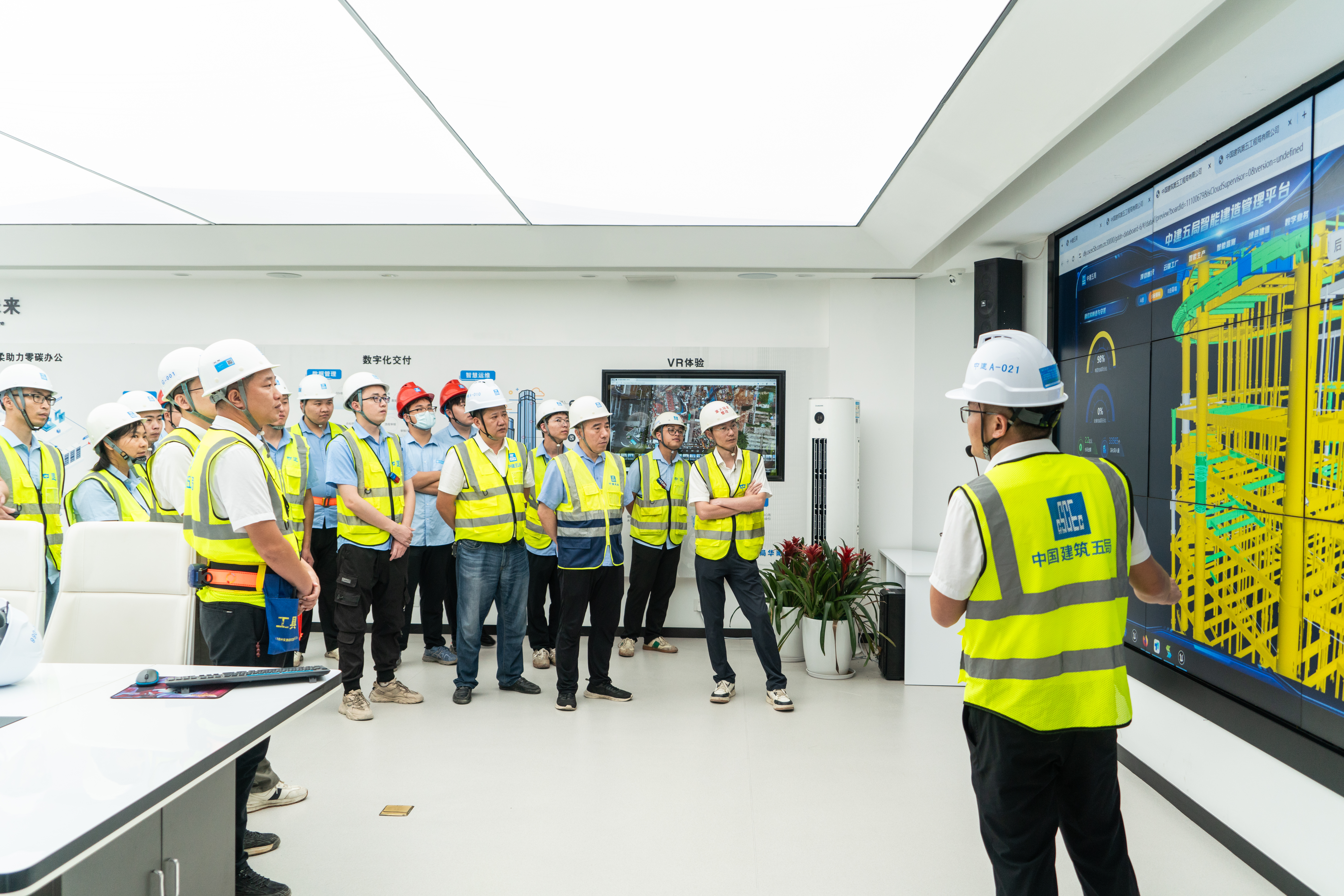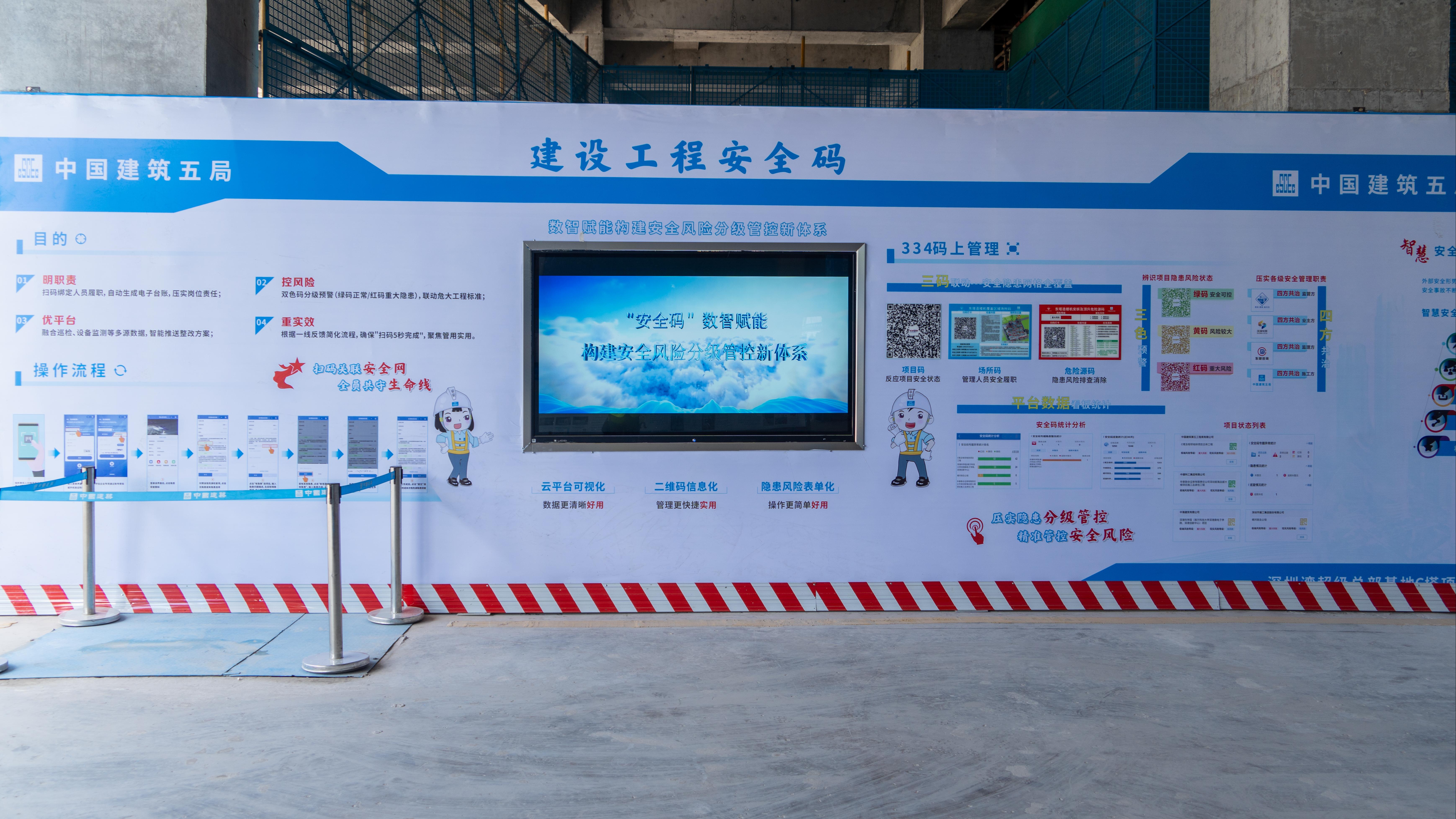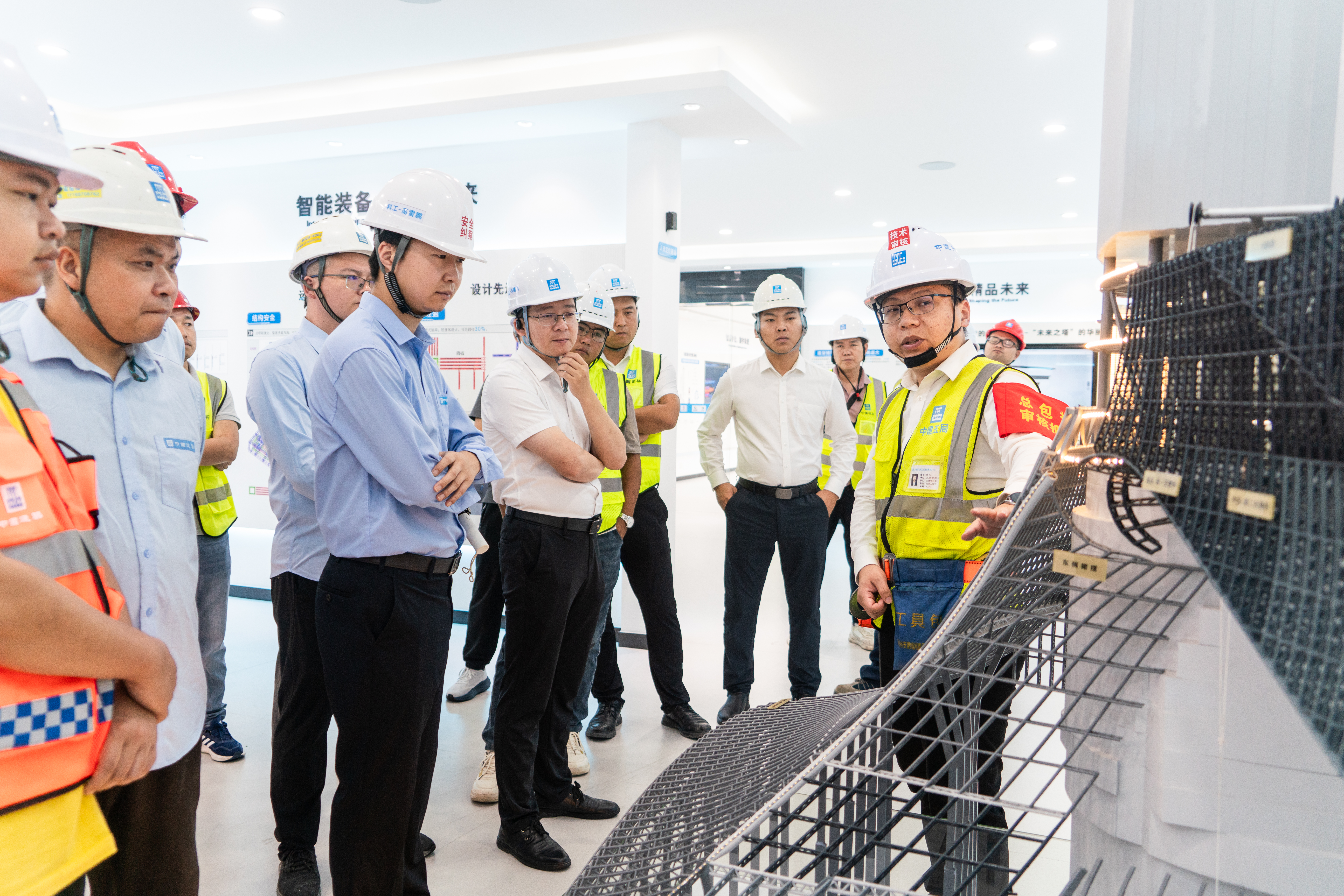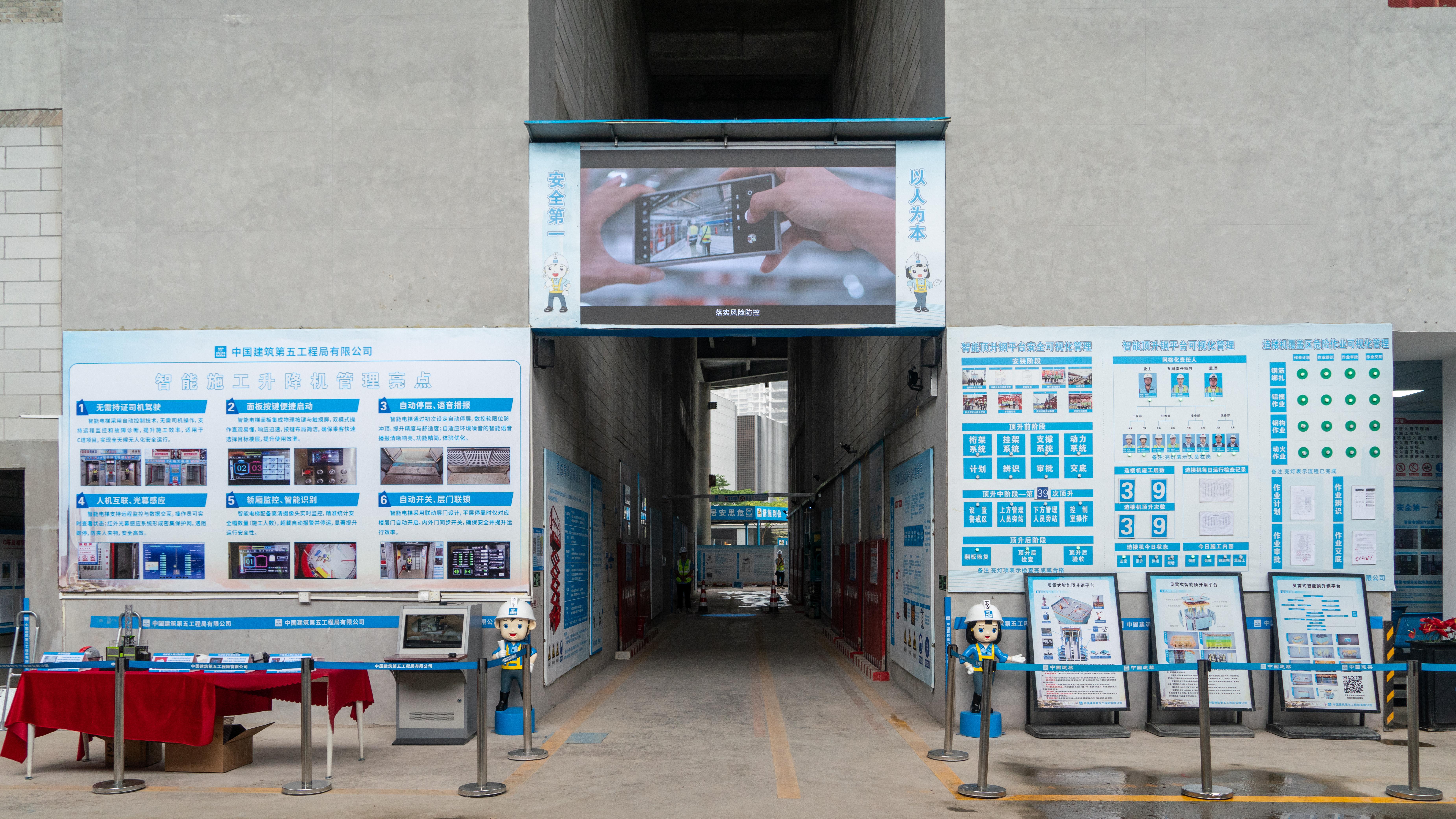 作为广东省观摩活动深圳区域唯一分会场,C塔项目设置了智能建造展厅、人本安全展区、科技兴安展区、设备临电安全展区、贝雷式智能顶升钢平台、钢结构连廊展示区、机电展示区、幕墙展示区八大展区,全方位呈现“科技+安全”的融合应用。其中,贝雷式智能顶升钢平台等硬核装备直观展示了超高层建筑施工安全保障技术;智能建造展厅通过模型、视频及数字化平台等多元形式集中展示了智能建造技术与项目实践。