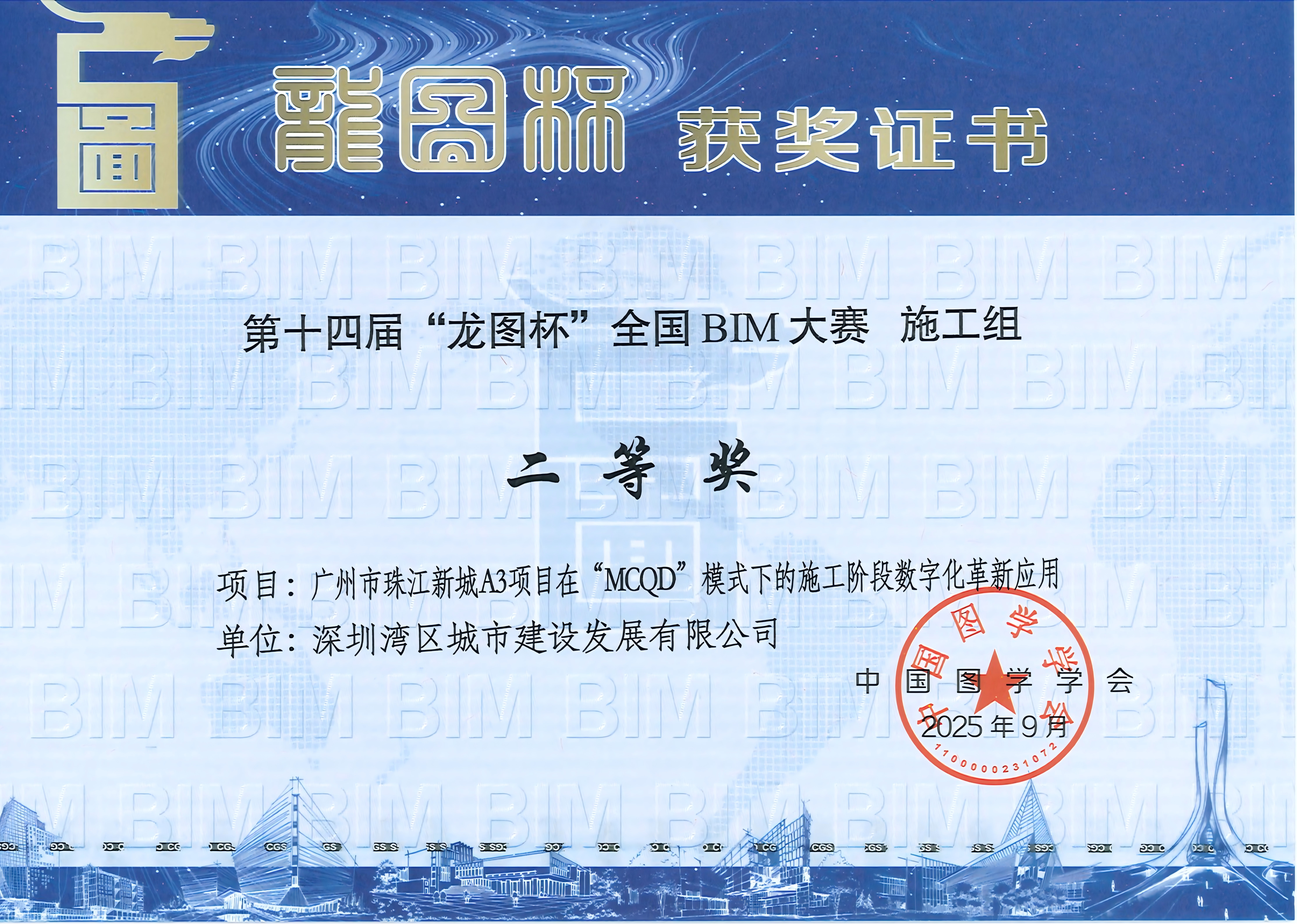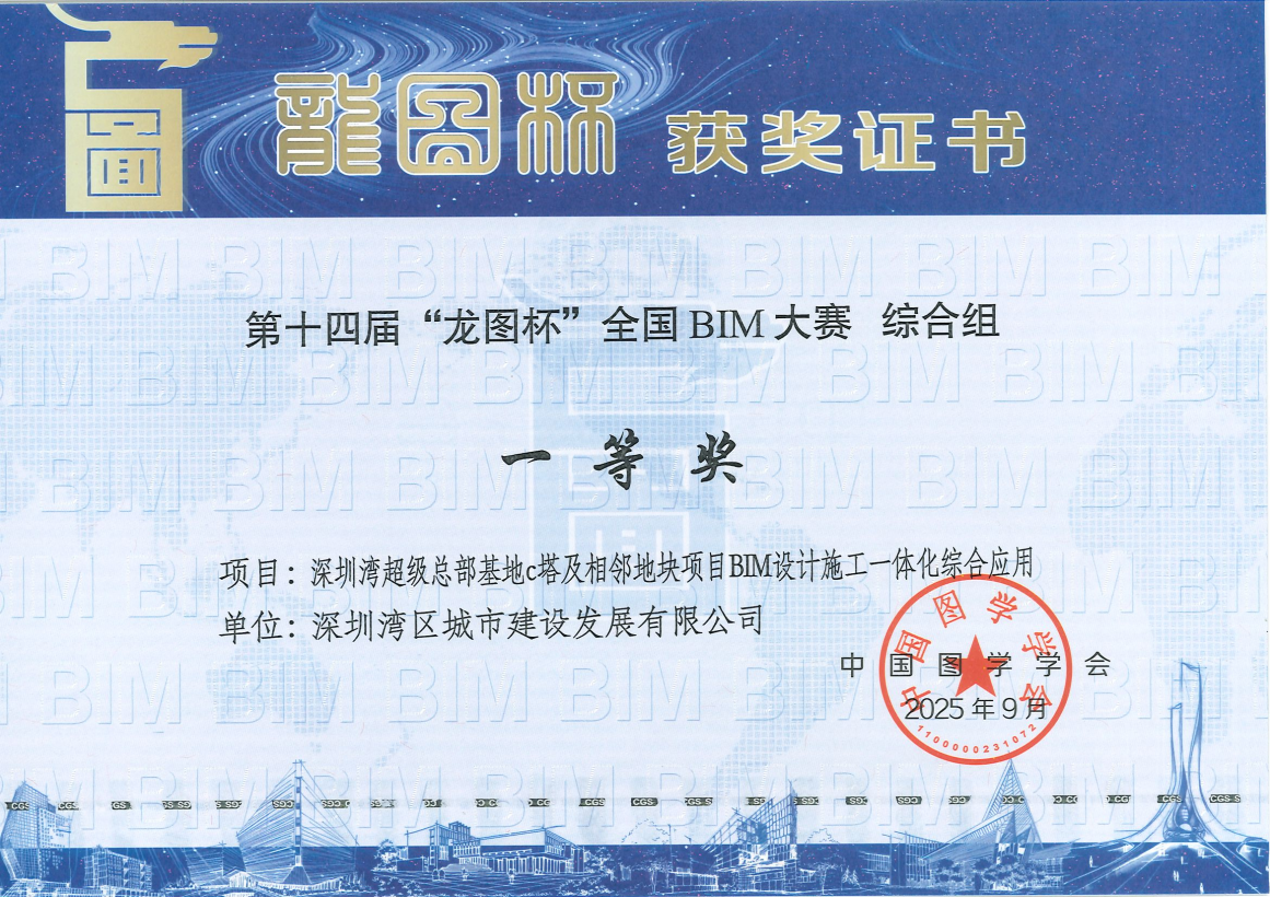 作为国内BIM领域最具权威的赛事之一,“龙图杯”大赛由中国图学学会主办,中国科学技术协会、清华大学等单位联合指导,本届大赛共收到2079项有效参赛作品,经初审、复审、现场答辩等严格环节评选,最终仅12个项目获综合一等奖,获奖比例仅3%。深湾发展双项目同获殊荣,既是国家层面对企业数字化实践的权威肯定,也是公司深耕智能建造领域的有力见证。